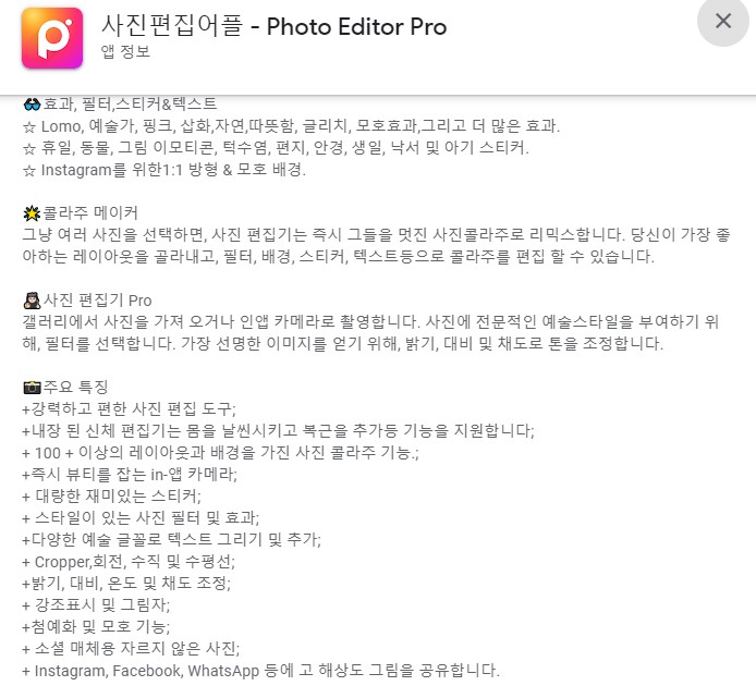 구글 플레이 스토어에 보면 어떤 사진 편집 어플이 좋은가 한번씩 검색해서 이용해도 좋을것 같아요 현재 많은 사람들이 이용하고 있는 사진편집어플 photo editor pro를 사용하거나 컷믹스 picsart 등 여러가지 사진을 이용해도 좋다고 생각이 듭니다.